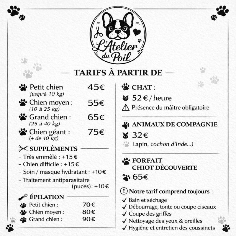 Découvrez les tarifs de L’Atelier du Poil pour un toilettage professionnel et respectueux, directement chez vous. Des prix transparents pour le bien-être de votre compagnon.